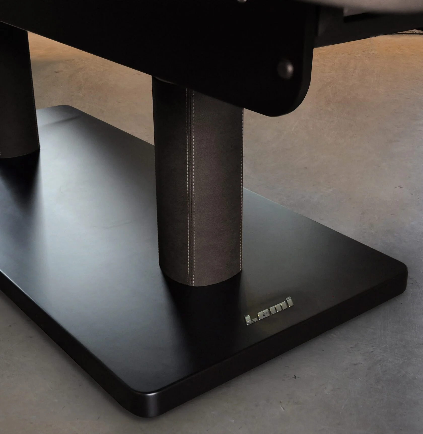 • Для удобства специалиста предусмотрено управление с помощью ножного пульта. Основание выполнено в виде двух колонн из изогнутого дерева со стальными элементами, что придает кушетке изысканный и современный вид.