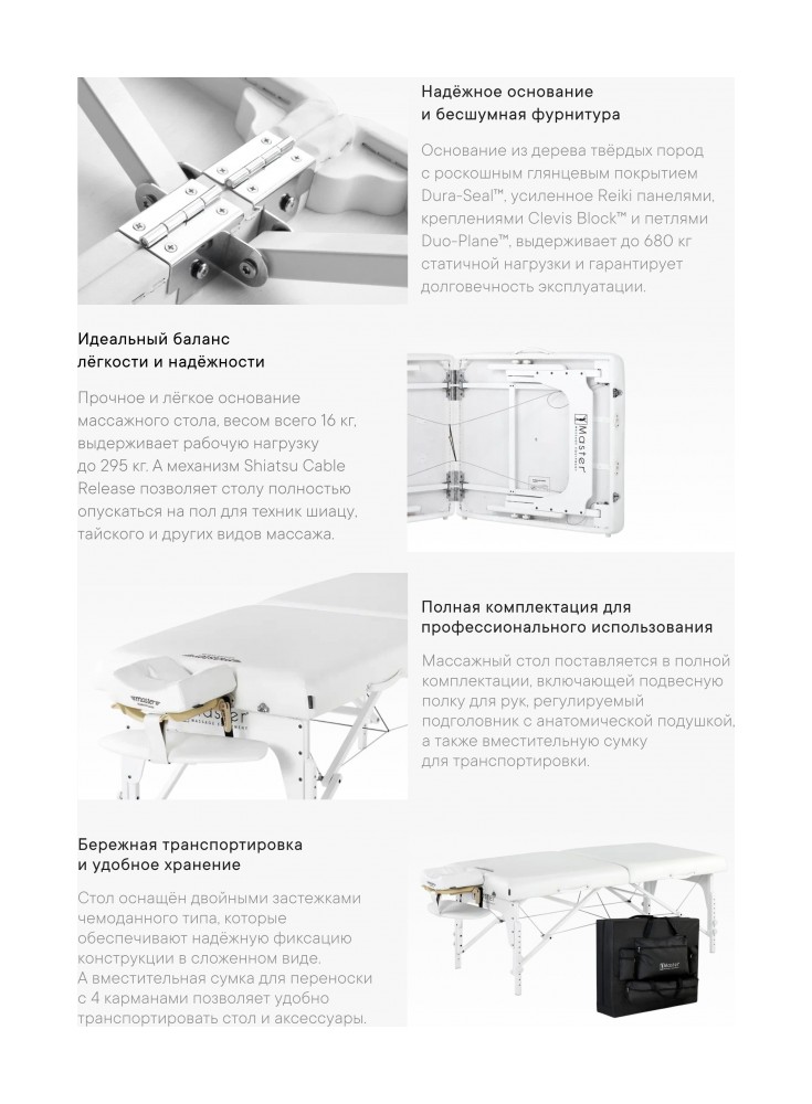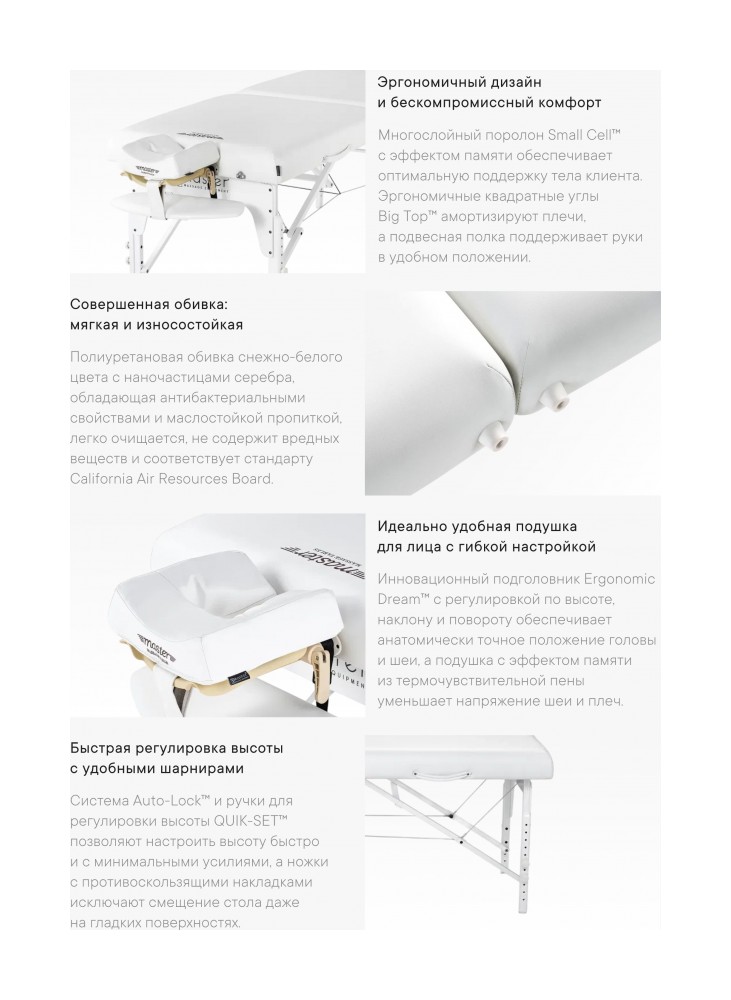 -Всё дерево — без формальдегида и канцерогенов, соответствует строгим экологическим стандартам штата Калифорния (CARB). -Широкое ложе BIG TOP™ — увеличенная на 26% площадь рабочей поверхности для большего комфорта. -Прямоугольные углы — обеспечивают более лучшую поддержку плеч, что подтверждено анатомическими исследованиями. -Наполнитель толщиной 7.6 см (3 дюйма) из многослойной пены Small Cell Foam™ — включает слой пены с эффектом памяти (MEMORY FOAM) для максимального комфорта. -Система Shiatsu — позволяет полностью разложить стол на полу. -Усиленные панели Reiki — в два раза толще стандартных, для повышенной прочности и устойчивости. -Обивка из PU — устойчива к маслам и влаге, не содержит CFC, усилена подкладкой «под джинсу» для дополнительной износостойкости. -Ножки из красного дерева (махагон) — с прочным глянцевым покрытием Dura-Seal™. -Система Auto-Lock™ — обеспечивает быструю и надёжную установку стола за несколько секунд. -Пронумерованные отверстия — обеспечивают быструю и точную регулировку высоты. -Петли DUO-PLANE™ — придают максимальную прочность в центральной части конструкции. -Противоскользящие насадки на ножках — не скользят и не оставляют следов, подходят для любого пола. -Нейлоновые прокладки на ножках — устраняют скрип и предотвращают расшатывание. -Стабилизирующая перекладина — повышает прочность и облегчает складывание/раскладывание стола. -Крепления ножек Clevis Block™ — обеспечивают надёжную фиксацию без риска поломки. -Двойные ручки Soft-Touch — удобны в использовании, обеспечивают безопасную и устойчивую фиксацию. -Двойные чемоданные застёжки — надёжно фиксируют стол в сложенном виде.
